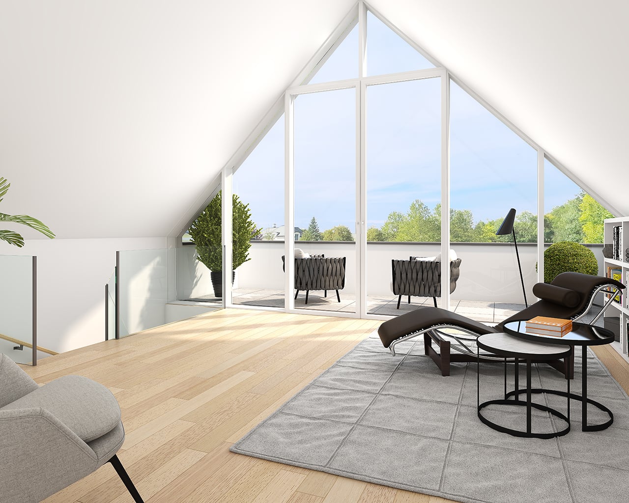 Das Highlight ist sicher das sehr lichte, bis zum Giebel offene Studio – ob als Büro oder als eigentlicher Wohnbereich – die großzügige Verglasung zur Dachterrasse sorgt für Penthouse Feeling.