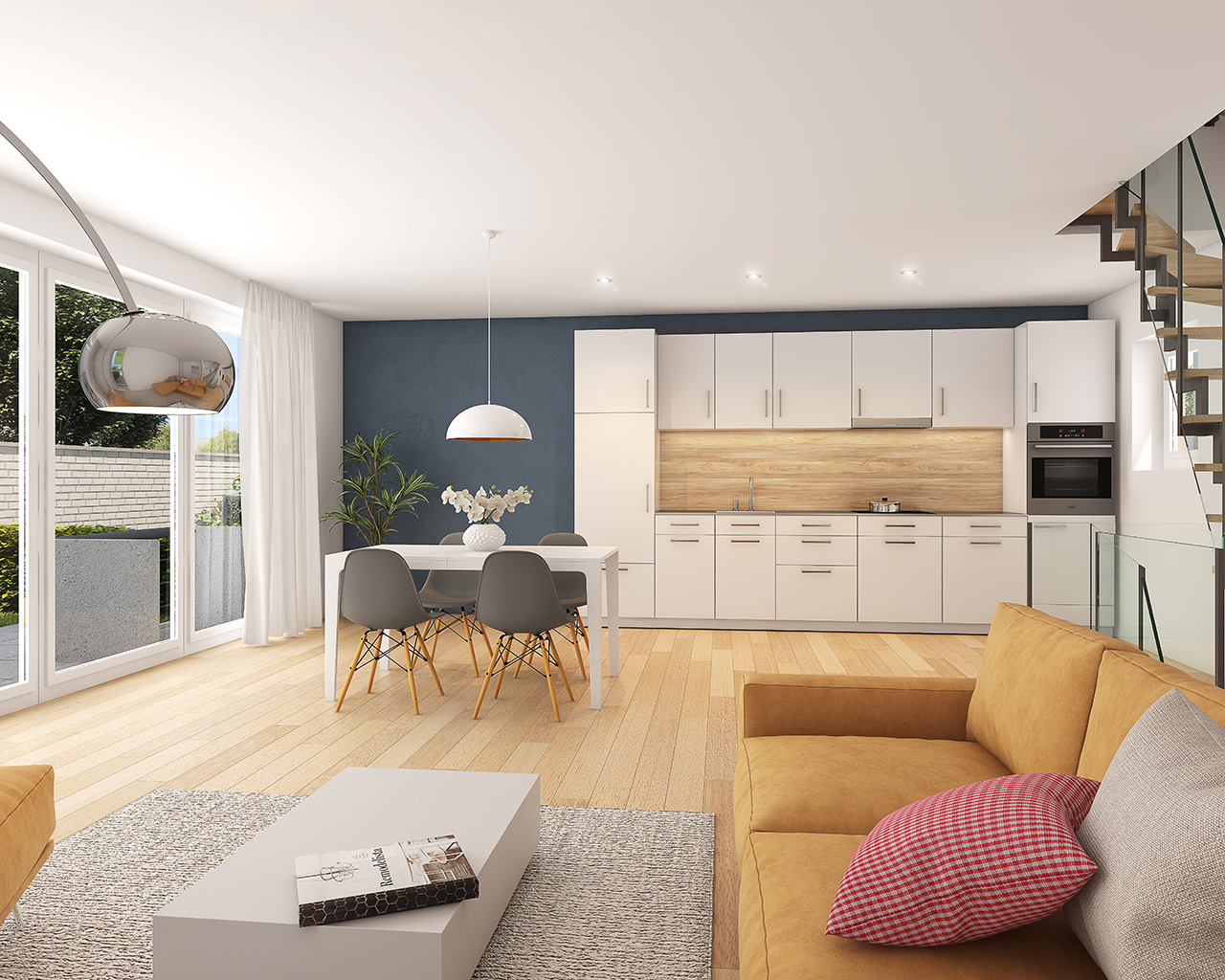 Die beiden 5-Zimmer- Maisone-en mit Lofstyle-Charakter bieten viel Raum für Familie und Beruf und mit der großen Garten– und der Dachterrasse Freilufplätze ohne großen Pflegeaufwand.